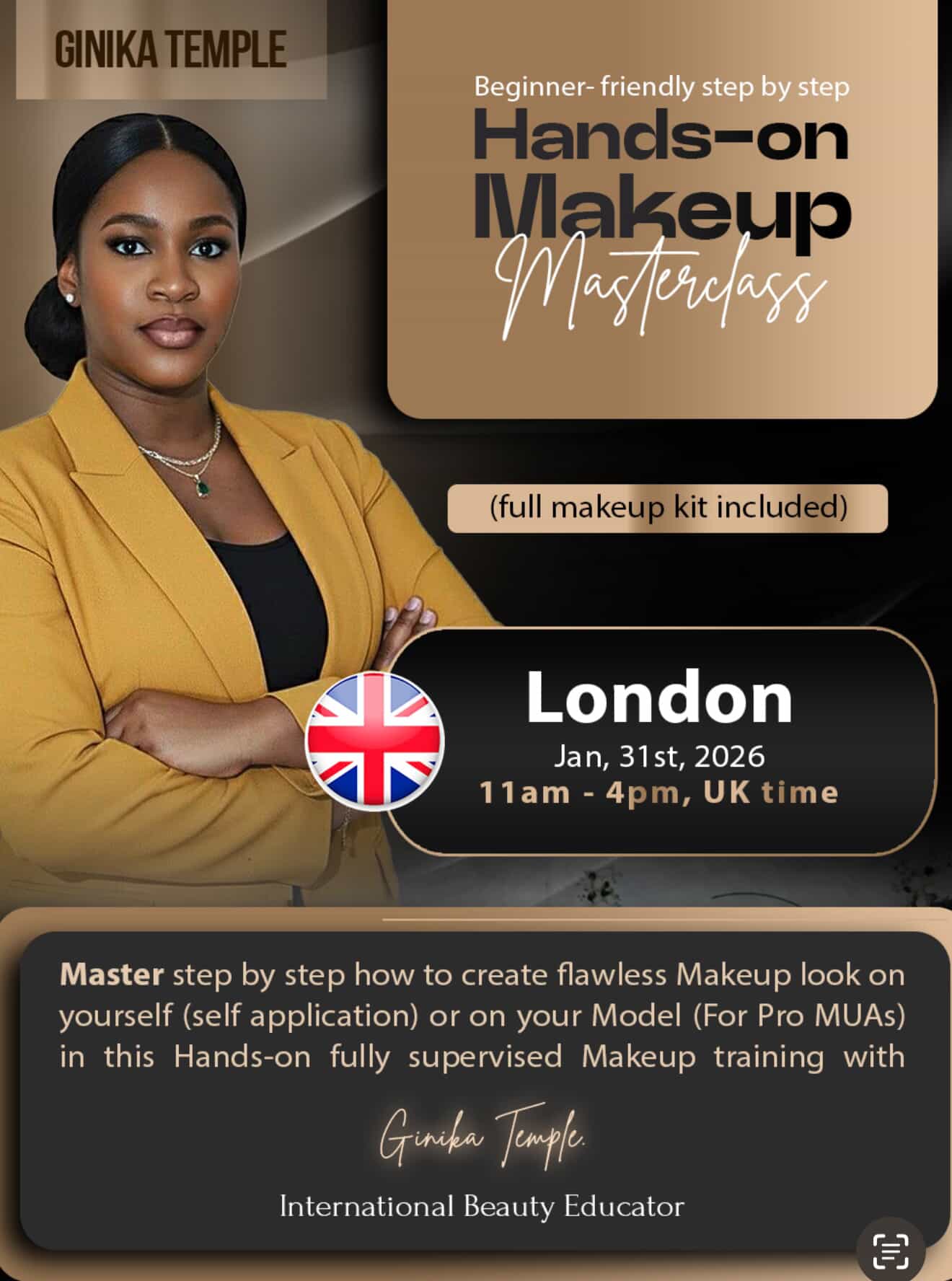 ✅ Complete Makeup Kit (Foundation, Concealers, Blush, Mascara, Eyeshadow, Lipstick, Lip liner, Primer, Setting powder, Pressed powder, Setting spray, Brow pencil, Lashes, Sponge, Full face Brush set, Eyeliner, LED mirror, Sponges, tools, etc. – all shade - matched for you specifically by Ginika) (Worth over £200) ALL YOURS TO KEEP.